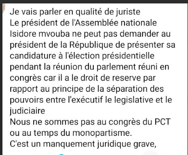 Il n’existe à ce jour aucun article qui interdit au président de l’Assemblée nationale d’émettre un avis politique, même dans un cadre solennel comme le Congrès. Aucune disposition ne sanctionne un appel public à candidature que ce soit dans la Constitution de 2015 , ou encore dans le Règlement intérieur de l’Assemblée nationale,