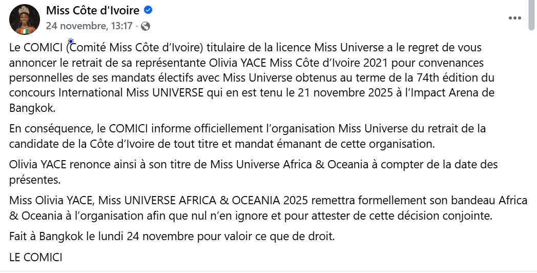 Par ailleurs, le 24 novembre 2024, le comité Miss Côte d’Ivoire a annoncé le retrait de la candidature d’Olivia Yacé de tout titre et mandat émanant de Miss Univers pour cause de convenances personnelles. Par conséquent, la miss Côte d’Ivoire 2021 a renoncé au titre honorifique de Miss Univers Afrique et Océanie. Une annonce qui a ravivé de plus belle la colère des fans de ce concours.