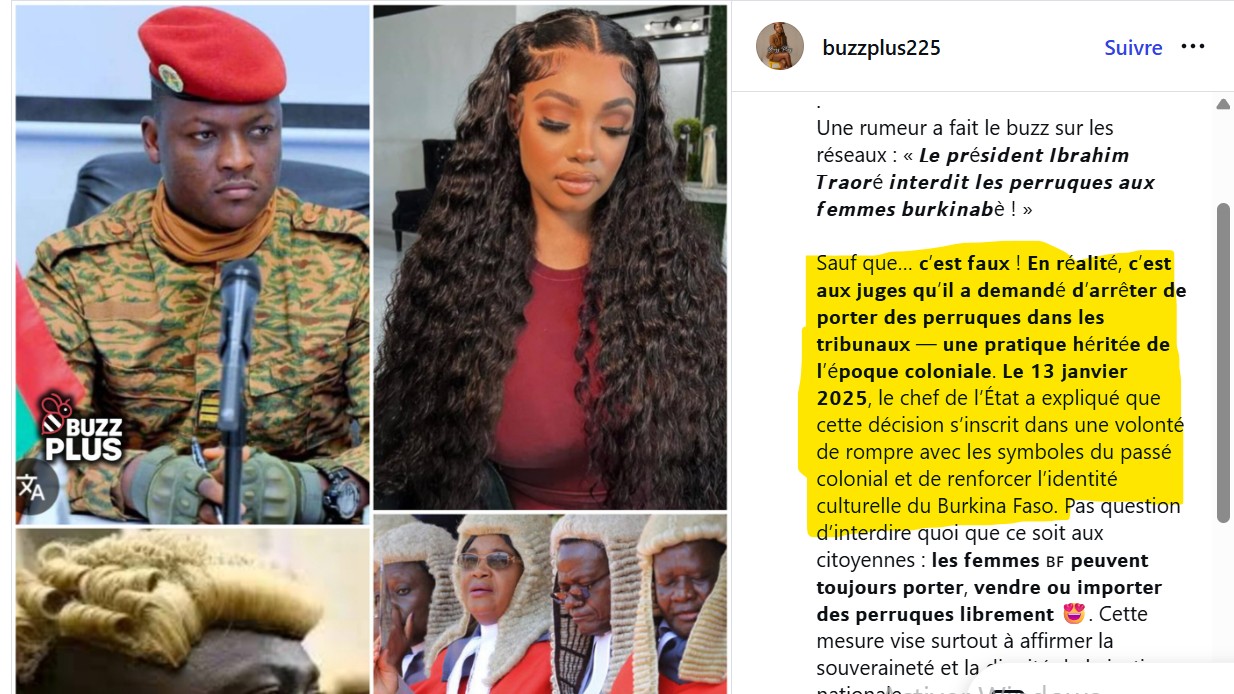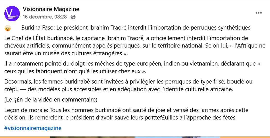 Depuis quelques jours, des publications largement partagées sur Facebook, WhatsApp et Tik-Tok (1, 2, 3, 4, 5, 6) affirment que le Burkina Faso a interdit l’importation des perruques, notamment les perruques artificielles ou importées de l’étranger. Selon ces messages, cette interdiction viserait à » protéger les valeurs culturelles burkinabè « , à « limiter certaines influences étrangères » et à « valoriser les coiffures traditionnelles et modernes africaines. » L’information est fausse.