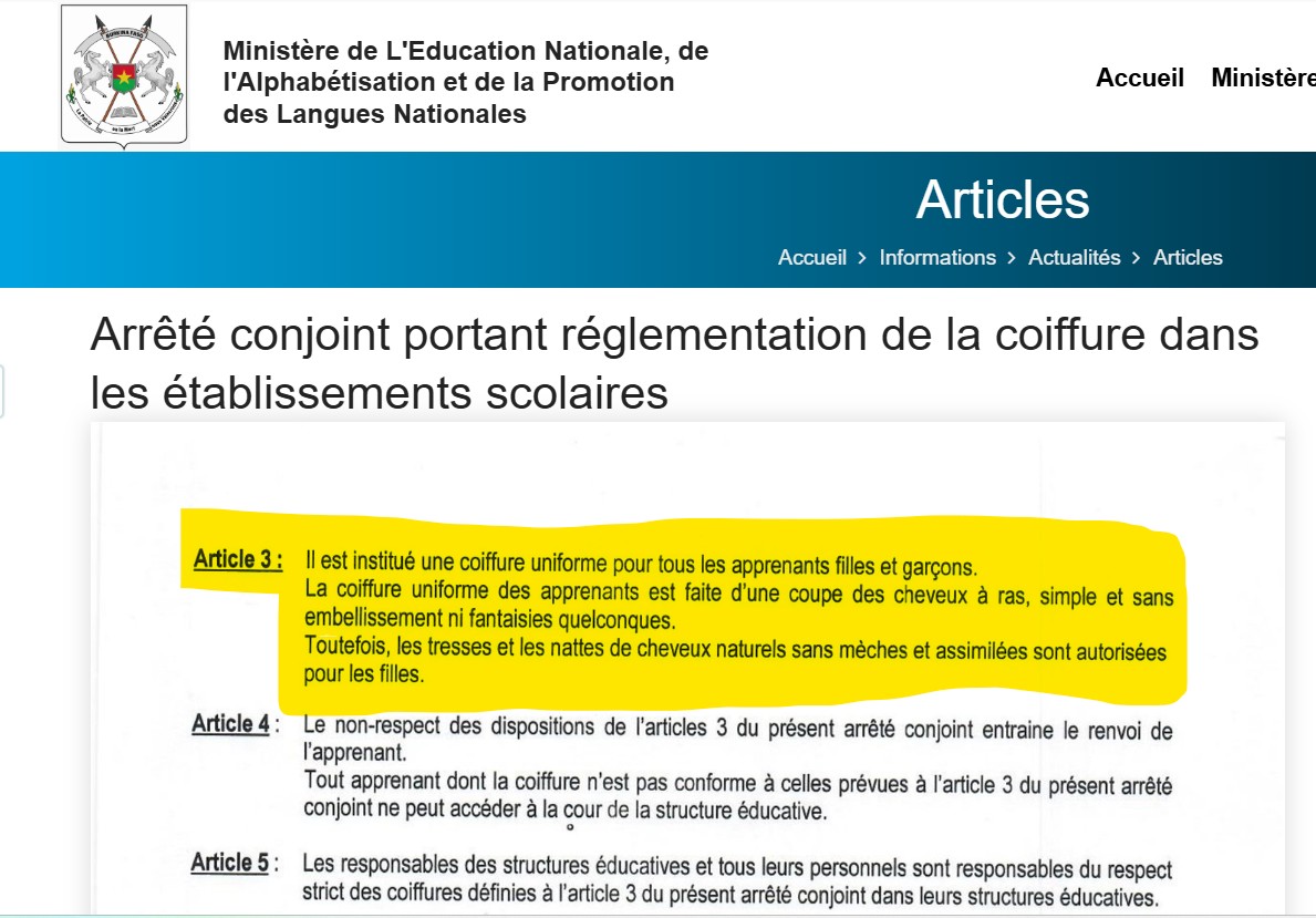 L’arrêté complet peut être lu ici. Toutefois, les tresses et les nattes de cheveux naturels sans mèches et assimilées sont autorisées pour les filles. Cette mesure est rentrée en vigueur lors de la rentrée 2024 – 2025. Cet article de TRT Afrika évoque également cet arrêté ministériel au Burkina Faso.