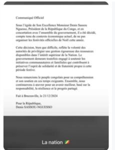 Depuis quelques heures, un communiqué, présenté comme officiel et attribué au président de la République du Congo, Denis Sassou-Nguesso, circule abondamment sur les réseaux sociaux. Ce document, daté du 21 décembre 2024, prétend annoncer la décision de ne pas organiser les festivités officielles de Noël en raison du contexte économique actuel difficile. Toutefois, après vérification, il s’agit d’un faux document.