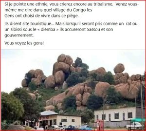 L’image publiée accompagnée d’un texte à caractère polémique, affirme : « Si je pointe une ethnie, vous crierez encore au tribalisme. Venez vous-même me dire dans quel village du Congo les gens ont choisi de vivre dans ce piège. Ils disent site touristique… Mais lorsqu’ils seront pris comme un rat ou un sibissi sous le « diemba », ils accuseront Sassou et son gouvernement », fin de citation.