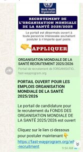 Une fausse annonce circule actuellement sur WhatsApp, prétendant ouvrir un portail pour le recrutement au « FONDS DES ORGANISATION MONDIALE DE LA SANTÉ 2025/2026 ». Cette annonce incite les candidats à cliquer sur un lien suspect : https://fast-wayprogram.org/who-recruitment.