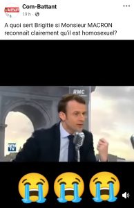 Une vidéo partagée sur Facebook par la page Com-Battant , suivie par plus de 110 mille followers, et sur WhatsApp dans divers groupes, attribue au président français Emmanuel Macron des propos dans lesquels il aurait reconnu être homosexuel.