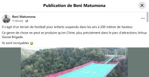 « Il s’agit d’un terrain de football pour enfants suspendu dans les airs à 200 mètres de hauteur. Ce type de terrain n’existe qu’en Chine, et plus précisément dans le parc d’attractions Jinhua Goose Brigade », souligne la légende d’une publication Facebook.