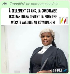 Une image largement partagée sur les groupes WhatsApp du Congo-Brazzaville affirme que Jessikah Inaba, à seulement 23 ans, est devenue la première avocate aveugle noire d’origine congolaise au Royaume-Uni. Cette information, accompagnée de sa photo en tenue d’avocate, a suscité de nombreuses réactions et un sentiment de fierté parmi les internautes au Congo.