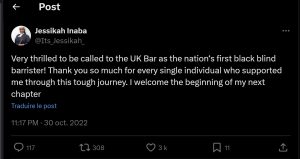 Il est confirmé que Jessikah Inaba est devenue la première avocate noire et aveugle du Royaume-Uni après avoir été admise au barreau britannique en octobre 2022. Elle a réussi cet exploit après cinq années d’études en droit à l’Université de Londres, malgré les défis liés à son handicap, tel qu’indiqué dans cet article de Face2Face Africa.