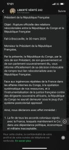Ce lundi, l’ambassade du Congo en France a publié un communiqué officiel démentant formellement l’authenticité de cette lettre. Le texte est qualifié de « falsification grossière », ne représentant aucunement la position officielle du gouvernement congolais. Il est rappelé que les relations bilatérales entre la République du Congo et la République française restent stables et cordiales.