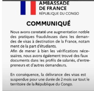 « La délivrance des visas est suspendue pour une durée de 2 mois sur tout le territoire de la République du Congo » en raison d’une augmentation de pratiques frauduleuses constatées dans les dossiers de demande de visa.