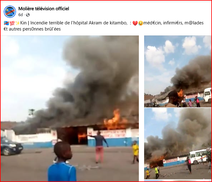 La légende accompagnant la vidéo indique : « RDC : hôpital en feu sur place à Kinshasa, médecins, malades et autres personnes brûlées. Pitié. »
