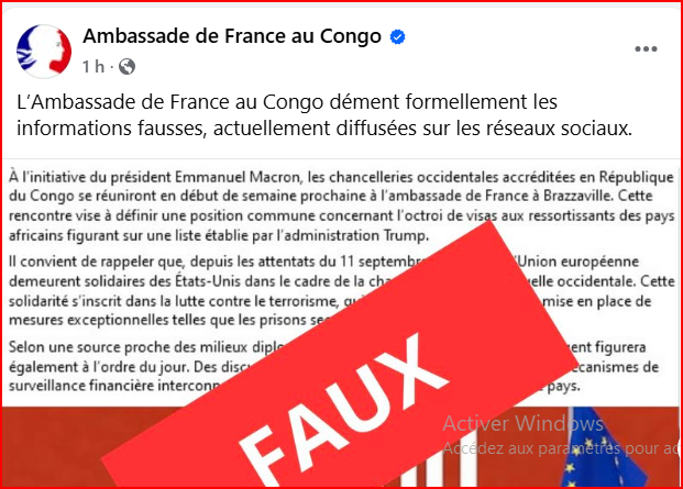 Une rumeur circule sur les réseaux sociaux, affirmant que les ambassades occidentales basées à Brazzaville, dont celle de France, organiseraient une réunion la semaine prochaine pour discuter de l’extension du travel ban imposé par les États-Unis à d’autres pays, notamment européens. Elle a été publiée par cette page et cette autre page sur Méta, ancien Facebook. Une publication beaucoup commentée, ce qui démontre de l’intérêt des abonnées de ces pages à l’information qui a été donnée. Seulement voilà, elle est fausse !