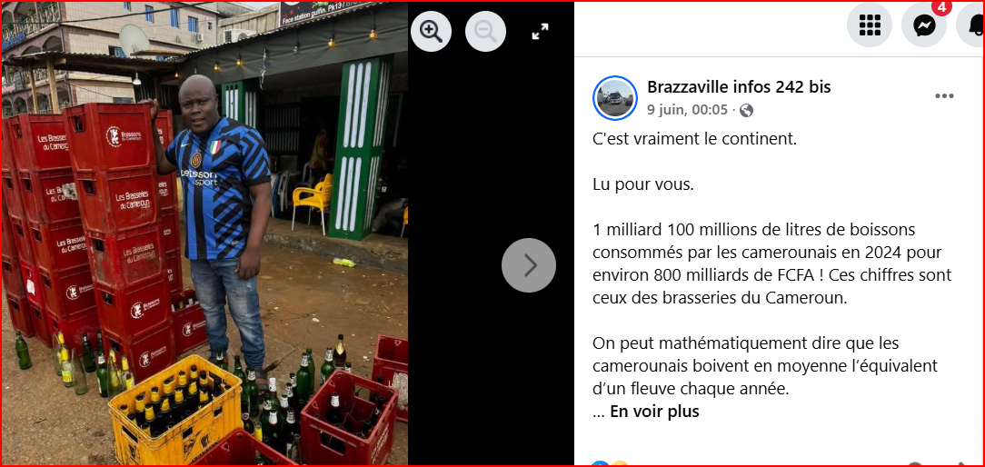 Une publication sur Facebook affirme que « les Camerounais ont consommé 1,1 milliard de litres de boissons en 2024, pour un montant global de 800 milliards FCFA, selon les Brasseries du Cameroun (SABC) ».
