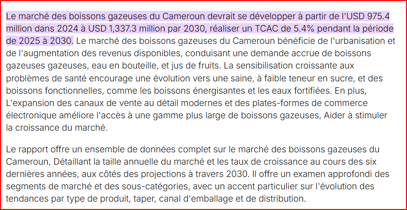 L’on peut lire dans cet article que le marché des boissons gazeuses du Cameroun devrait se développer à partir de l’USD 975.4 million en 2024 à USD 1,337. 3 million par 2030, réaliser un TCAC de 5.4% pendant la période de 2025 à 2030. Un chiffre qui pourrait dépasser les 780 à 800 milliards FCFA grâce à la hausse des capacités de production et des prix.