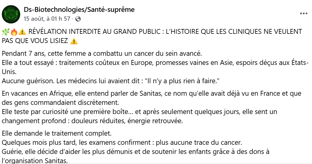 Selon cette publication, une certaine « Madame Honorine » aurait été guérie d’un cancer du sein grâce aux produits Sanitas Bio, après avoir essayé plusieurs traitements couteux en Europe et aux USA.