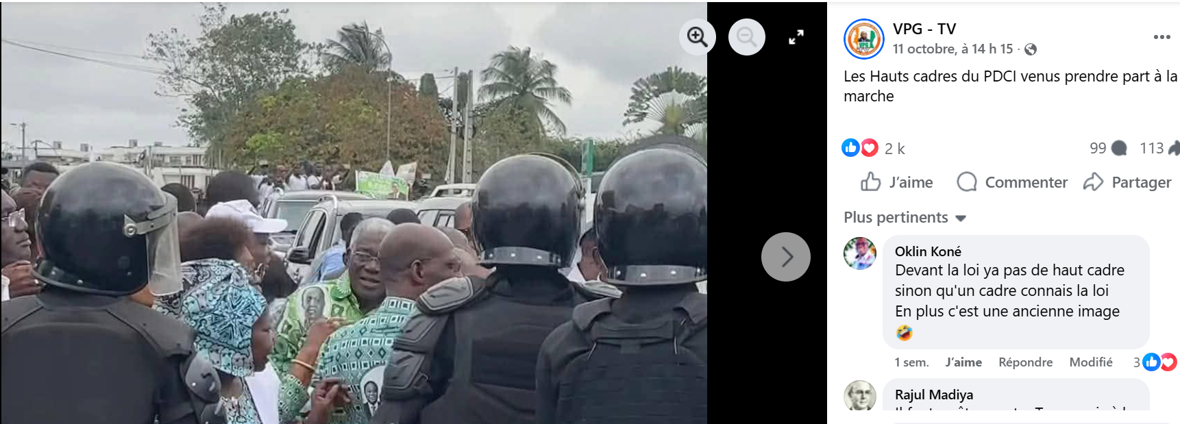 Depuis le week-end du 11 octobre 2025, des publications virales circulent sur Facebook et d’autres plateformes, présentant une photo montrant des militants du PDCI-RDA entourés de policiers anti-émeute, accompagnée du texte : « Les hauts cadres du PDCI venus prendre part à la marche ».