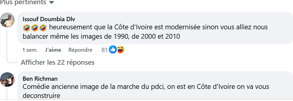 La publication, relayée notamment par plusieurs pages (1, 2, 3), prétend documenter la participation de hauts cadres du PDCI à la marche de l’opposition ivoirienne à Abidjan tenue le 11 octobre dernier, malgré son interdiction par les autorités de la ville. Or, après vérification, cette photo n’a rien à voir avec ladite marche. Elle a été prise plusieurs semaines plus tôt, à Abidjan, le jour du dépôt du dossier de candidature de Tidjane Thiam à la Commission électorale indépendante (CEI). Plusieurs internautes ont d’ailleurs réagi à cette infox, comme le montre cette capture :