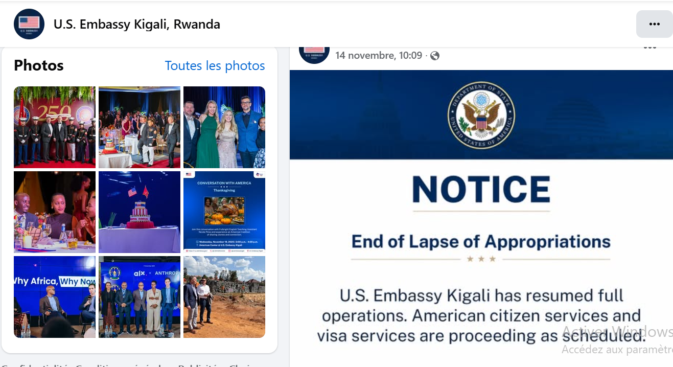 Une annonce publiée par l’ambassade le 1er Octobre 2025 sur sa page officielle Facebook avait annoncé la fermeture du Centre Américain de Kigali situé dans l’enceinte même de l’Ambassade des USA à Kigali, avant d’annoncer le 14 novembre dernier la reprise de toutes les activités au sein de l’administration américaine basée au Rwanda.