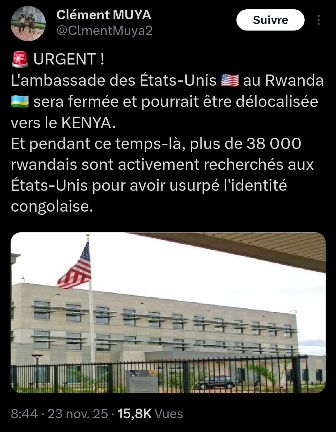 2025, une alerte d’urgence affirmant que “ l’Ambassade des États-Unis au Rwanda pourrait être délocalisée vers le Kenya, et que plus de 38 000 rwandais sont activement recherchés aux États-Unis pour usurpation de la nationalité congolaise”.