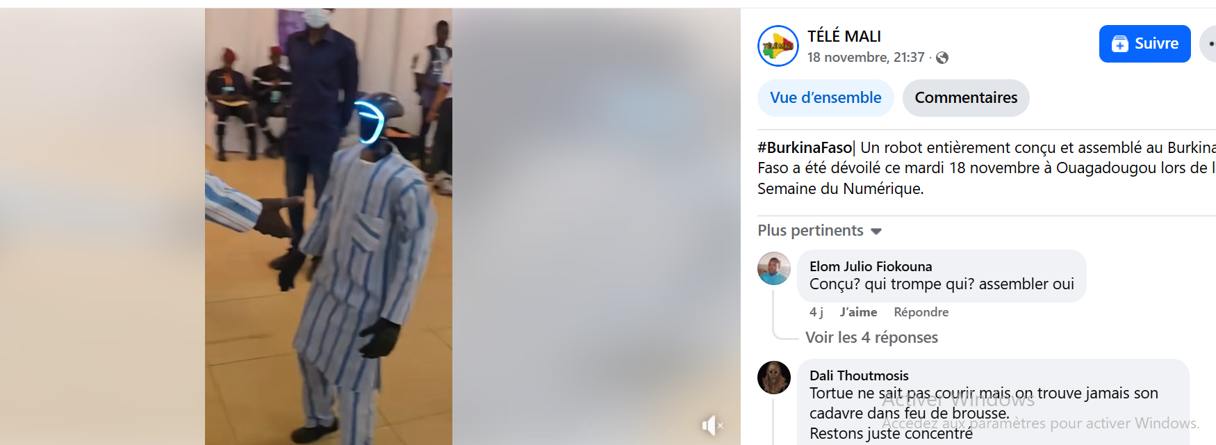 Une vidéo virale postée sur plusieurs pages Facebook comme 1, 2, 3 , 4 et YouTube montrant un robot en mouvement, est accompagnée des messages affirmant que ce robot a été créé au Burkina Faso , suscitant plusieurs réactions dans les commentaires de ces publications, montrant ainsi l’intérêt du public sur le sujet.