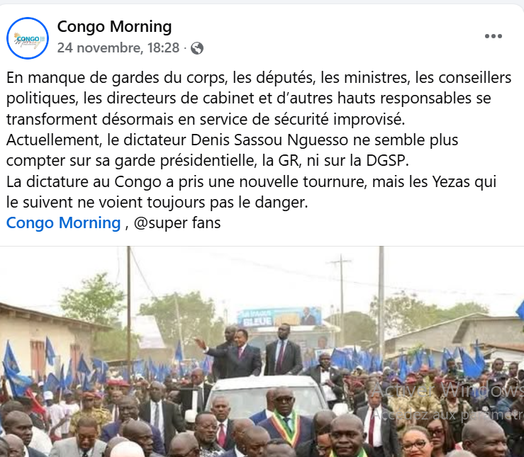 Dans une publication d’un média en ligne sur les réseaux sociaux montrant plusieurs photos du président congolais Denis Sassou Nguesso entouré de plusieurs personnes notamment des députés nationaux arborant leurs écharpes vert-jaune-rouge, symboles du drapeau national, ainsi que de plusieurs membres du gouvernement, tous marchant aux côtés du véhicule du Chef de l’Etat lors des descentes à l’intérieur du pas, il est affirmé que ces derniers font désormais partie de sa garde personnelle , à défaut d’une garde bien formée.