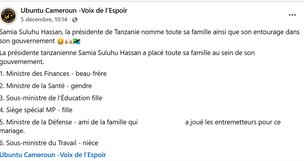 Depuis fin novembre 2025, des publications circulent sur les réseaux sociaux(1, 2 ) affirmant que la présidente tanzanienne, Samia Suluhu Hassan aurait nommé « toute sa famille » au sein de son nouveau gouvernement.