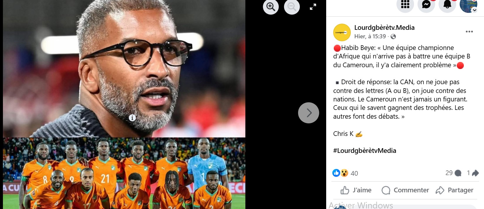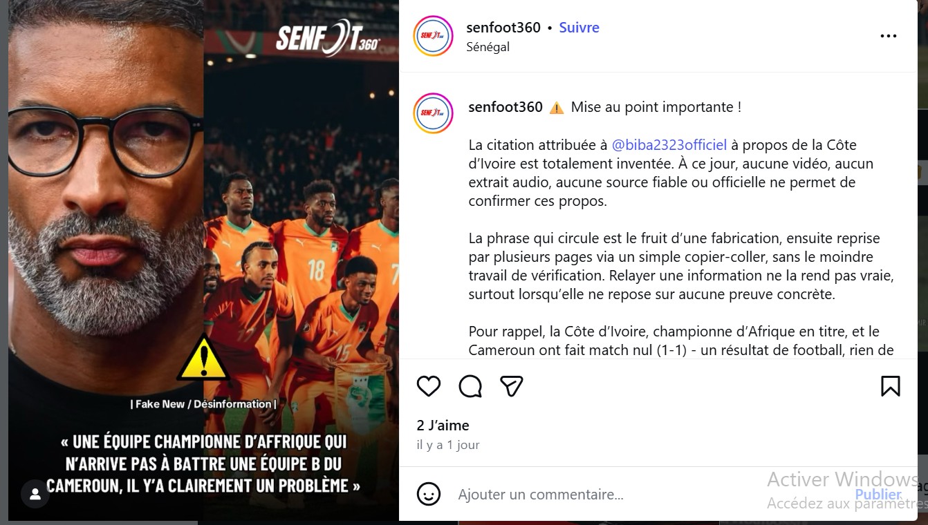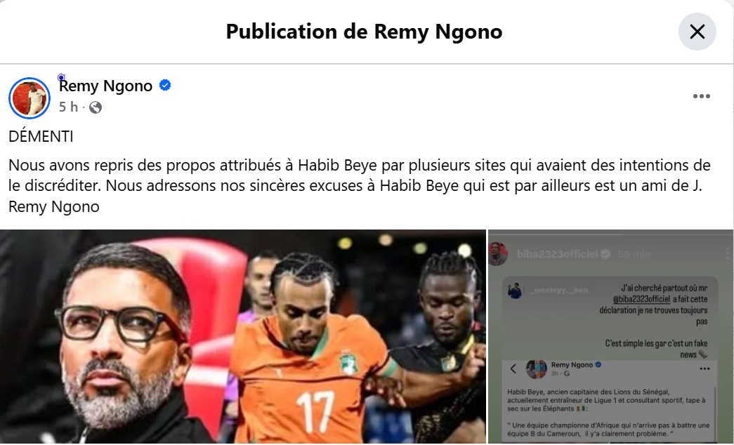 Cette déclaration attribuée à Habib Bèye, ancien capitaine des Lions de la Teranga du Sénégal et consultant sportif, a provoqué une vive polémique sur les réseaux sociaux ces derniers jours, et est devenue rapidement virale ( 1, 2, 3, 4, 5) . Relayée notamment par le journaliste camerounais Rémy Ngono, collaborateur de Radio France Internationale (RFI), la citation laisse entendre que l’ancien international sénégalais aurait sévèrement critiqué l’équipe nationale de Côte-d’Ivoire, championne d’Afrique en titre. Or, après vérification, cette déclaration est contestée par son supposé auteur, qui en a formellement démenti l’authenticité.