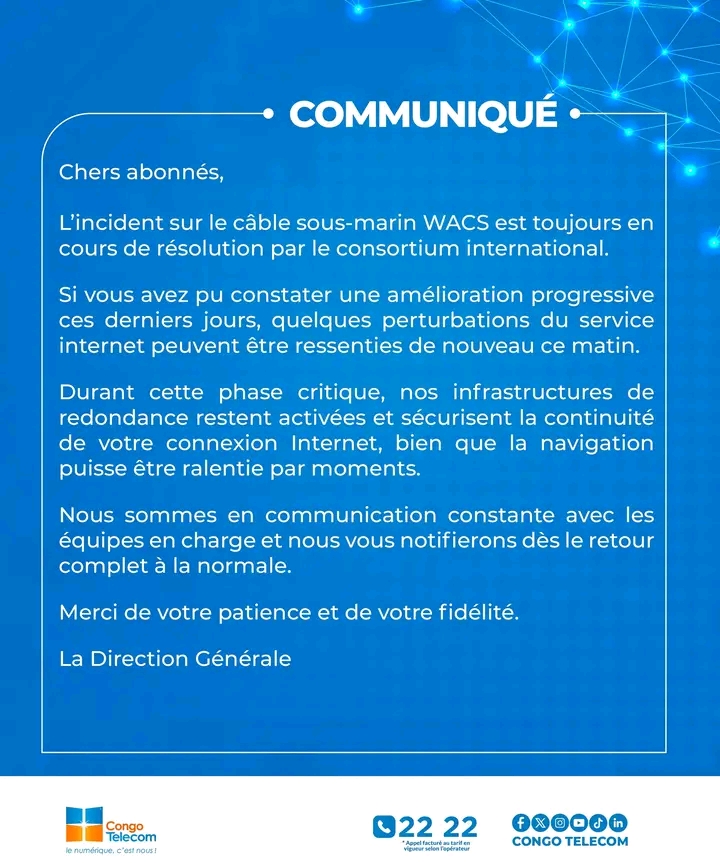 ‎L’opérateur national des télécommunications, Congo Telecom a publié le 02 janvier 2026 sur sa page officielle Facebook , un communiqué annonçant  qu’un incident était survenu au niveau du câble international sous-marin West Africa Cable System (WACS).