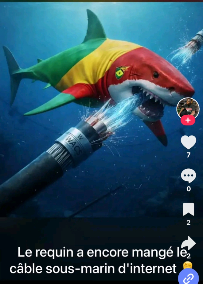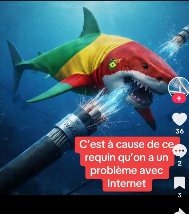 ‎Un requin aurait mangé le câble internet en République du Congo, d’après plusieurs publications sur TikTok ( 1, 2, 3, 4 , 5, 6 ) et  Facebook ( 1, 2 ) qui affirment que c’est la raison pour laquelle la connexion est devenue lente et instable au Congo, depuis fin décembre 2025.