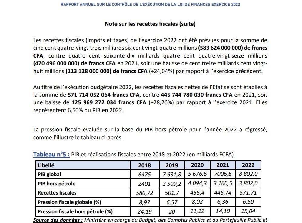Le livre mentionne notamment un niveau de recettes non pétrolières estimées à 1 075 milliards FCFA en 2025. Ce chiffre qui est global (non pétrolier), n’est pas isolé comme “recettes douanières” ; ce qui ne permet pas de vérifier une évolution spécifique de la DGDDI entre 2018 et 2025.