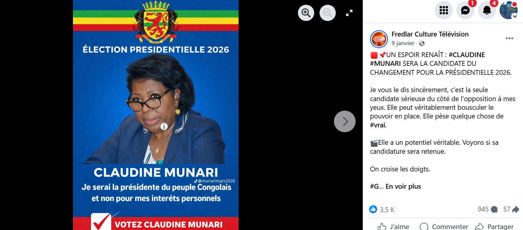 Plusieurs publications ( 1, 2, 3, 4) diffusées sur les réseaux sociaux depuis janvier 2026 affirment que Claudine Munari, députée de la circonscription de Mouyondzi (département de la Bouenza), serait candidate à l’élection présidentielle du 15 mars 2026.