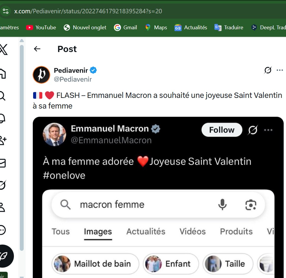 La publication affirmant que le président français a écrit un message souhaitant une joyeuse Saint-Valentin sur X est fausse. Aucun message de ce type n’existe sur son compte officiel. Il a seulement partagé une photo avec son épouse sur Instagram, sans texte romantique.