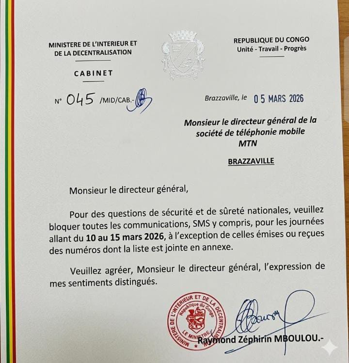 Cette note administrative circule actuellement sur les réseaux sociaux au Congo- Brazzaville. Le document, présenté comme provenant du ministère de l’Intérieur et de la Décentralisation et censé être signé par ce dernier, demande au directeur général de MTN Congo de bloquer toutes les communications téléphoniques et les SMS à dater du 10 au 15 mars 2026, pour cause de sécurité nationale, et de ne laisser fonctionnel que quelques numéros joints dans une liste.