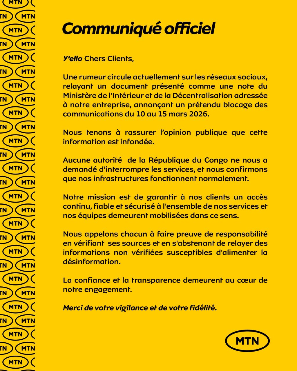 Par ailleurs, l’opérateur de téléphonie mobile MTN Congo, a publié un communiqué de presse sur sa page Facebook officiel, dans lequel il dément l’information et invite les abonnés à plus de responsabilité en vérifiant les informations.