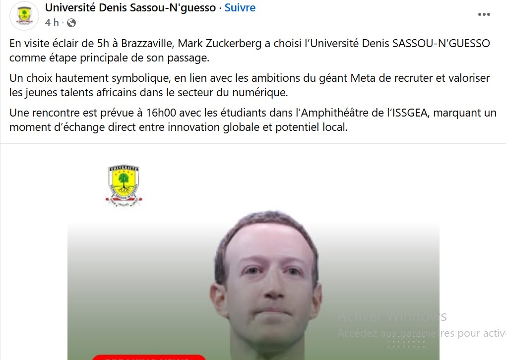 Sur la page Méta officielle de Mark Zuckerberg, aucune information ou publication n’évoque une visite éclair à Brazzaville ce 1er Avril .