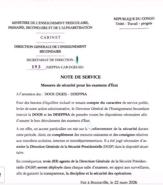 En République du Congo, une correspondance administrative du ministère de l’enseignement préscolaire, primaire, secondaire et de l’ alphabetisation, MEPPSA en sigle, datant du 22 mars informe que, trois agents de la direction générale de la sécurité